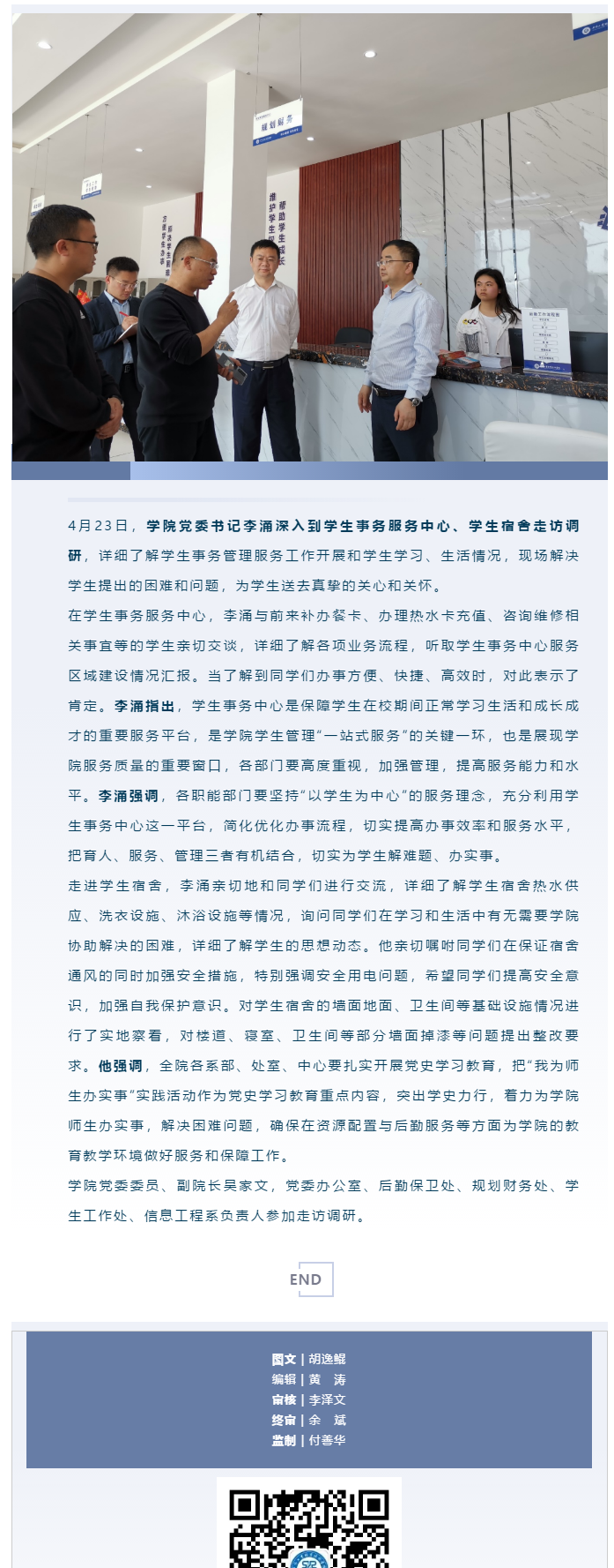 突出學(xué)史力行,為學(xué)生辦實(shí)事解難題 ——畢節(jié)工職院黨委書(shū)記李涌到學(xué)生事務(wù)服務(wù)中心、學(xué)生宿舍走訪調(diào)研