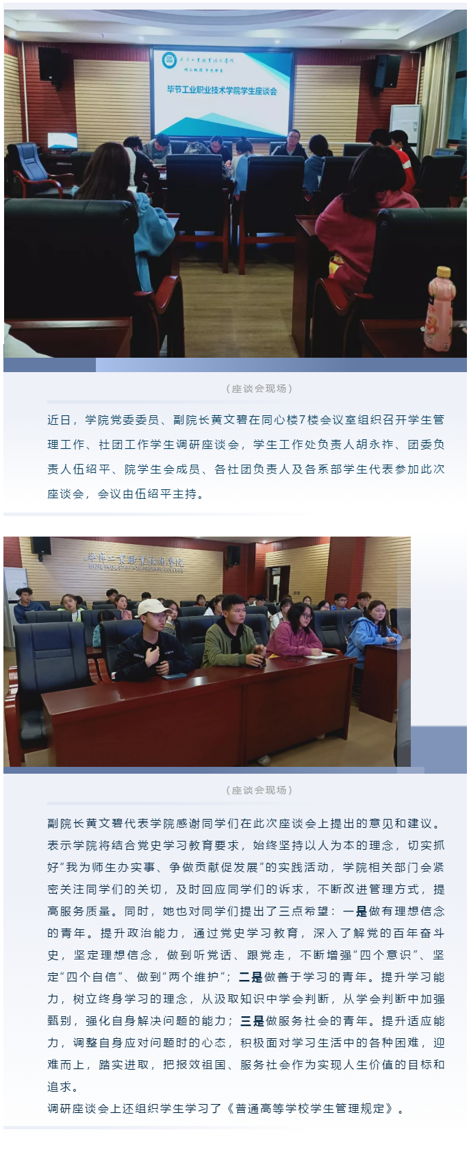 我為師生辦實事、爭做貢獻促發(fā)展——畢節(jié)工業(yè)職業(yè)技術學院召開學生調研座談會