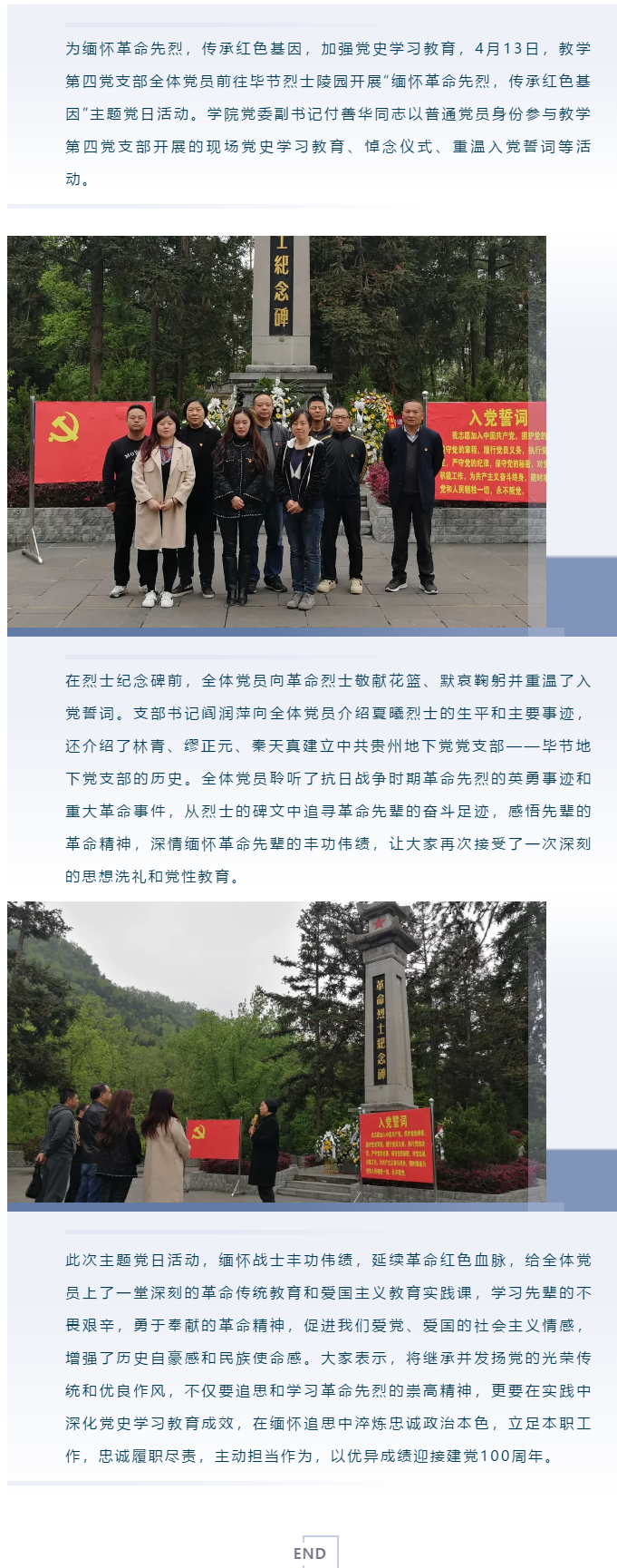 畢節(jié)工業(yè)職業(yè)技術(shù)學(xué)院教學(xué)第四黨支部開(kāi)展“學(xué)黨史,緬懷革命先烈,傳承紅色基因”主題黨日活動(dòng)