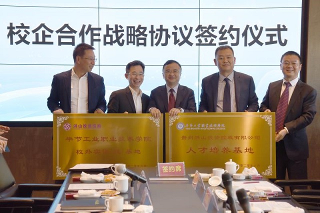 隨后,貴州洪山投資控股有限公司董事長(zhǎng)金烈森和學(xué)院院長(zhǎng)邱國(guó)援簽訂了校企合作戰(zhàn)略協(xié)議書,并完成授牌儀式。