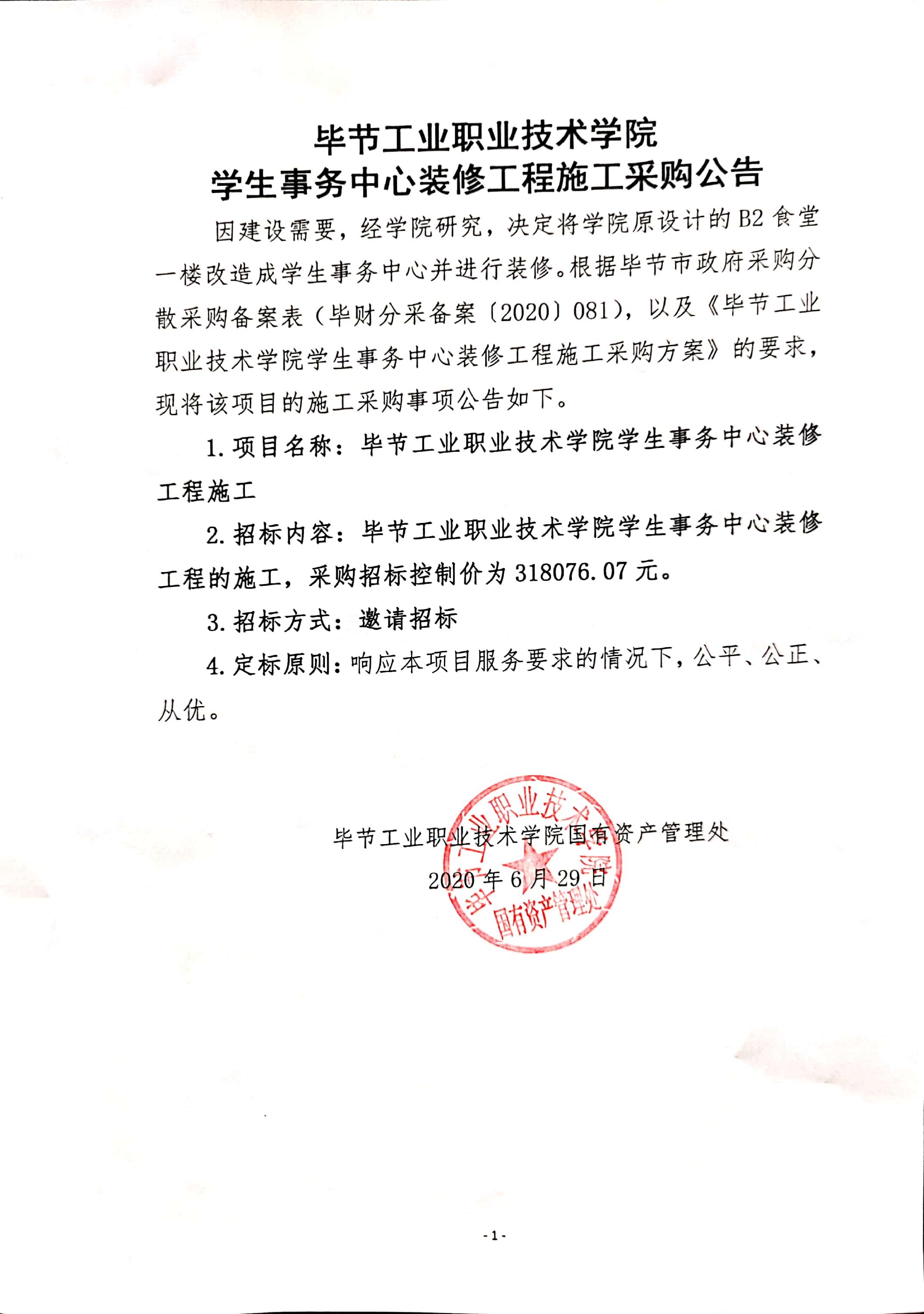 畢節(jié)工業(yè)職業(yè)技術學院學生事務中心裝修工程施工采購公告