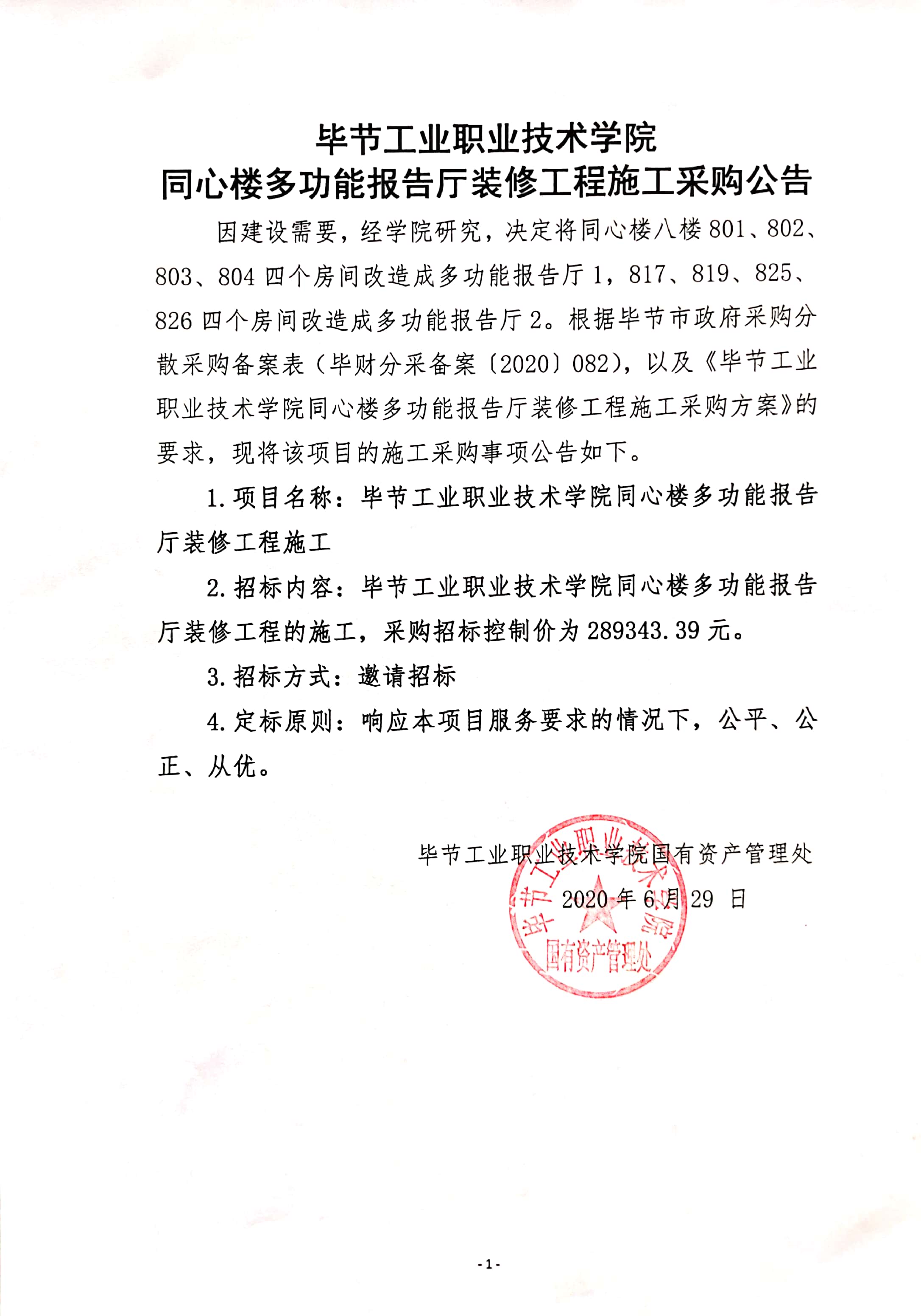 畢節(jié)工業(yè)職業(yè)技術(shù)學(xué)院同心樓多功能報(bào)告廳裝修工程施工采購(gòu)公告