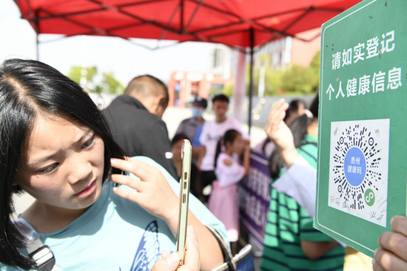 (新生在校門口掃描健康碼,憑綠碼進入學(xué)校)