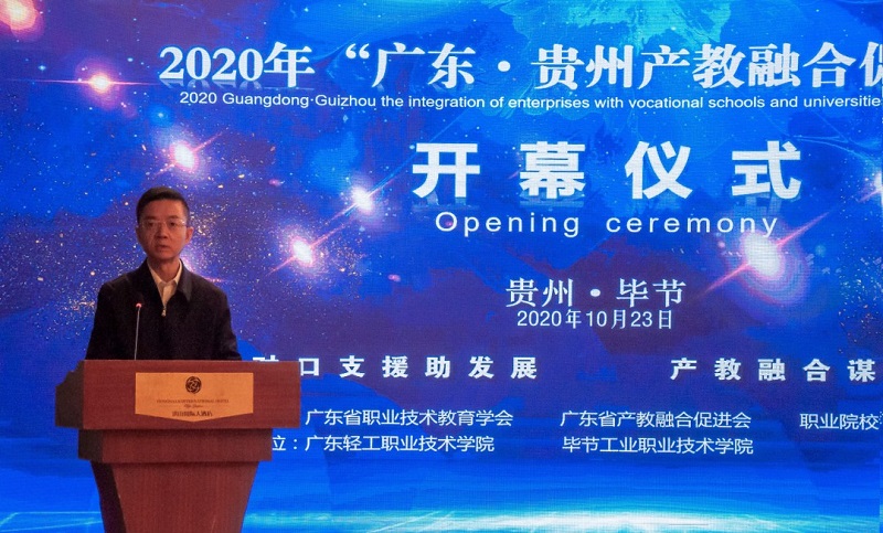 10月23日,廣東?貴州產(chǎn)教融合促進(jìn)大會(huì)在畢節(jié)隆重召開。廣東省教育廳巡視員朱俊文,貴州省教育廳一級巡視員鞠洪出席會(huì)議并致辭,畢節(jié)市委常委、副市長胡愛斌致歡迎辭,廣東輕工職業(yè)技術(shù)學(xué)院黨委書記杜安國作介紹,會(huì)議由畢節(jié)工業(yè)職業(yè)技術(shù)學(xué)院黨委副書記、院長邱國援全程主持。廣東省教育廳、貴州省教育廳、廣州市教育局、畢節(jié)市教育局相關(guān)負(fù)責(zé)人及參與產(chǎn)教融合大會(huì)的校企單位主要負(fù)責(zé)人參加會(huì)議。此次會(huì)議由廣東省職業(yè)技術(shù)教育學(xué)會(huì)、廣東省產(chǎn)教融合促進(jìn)會(huì)、職業(yè)院校協(xié)同發(fā)展聯(lián)盟主辦,廣東輕工職業(yè)技術(shù)學(xué)院、畢節(jié)工業(yè)職業(yè)技術(shù)學(xué)院承辦。