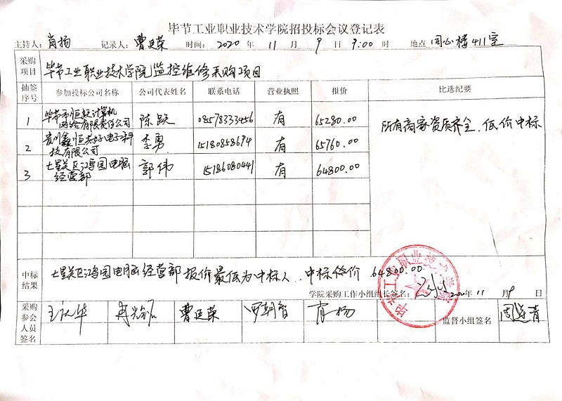 畢節(jié)工業(yè)職業(yè)技術(shù)學(xué)院監(jiān)控維修采購項目中標(biāo)公告