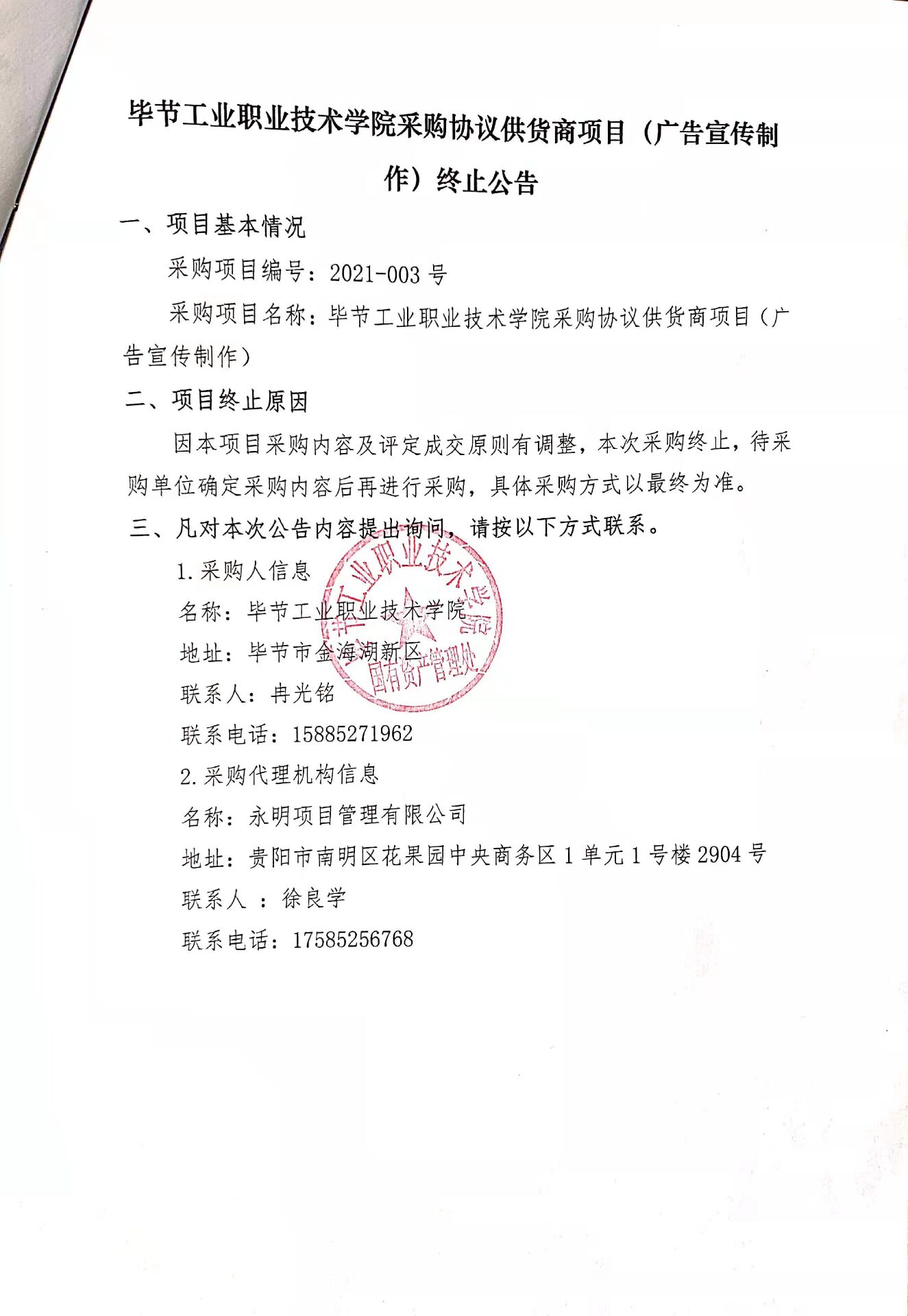 畢節(jié)工業(yè)職業(yè)技術(shù)學(xué)院采購協(xié)議供貨商項目(廣告宣傳制作)終止公告