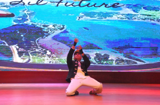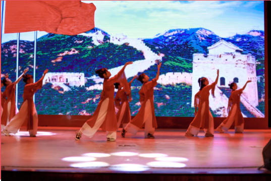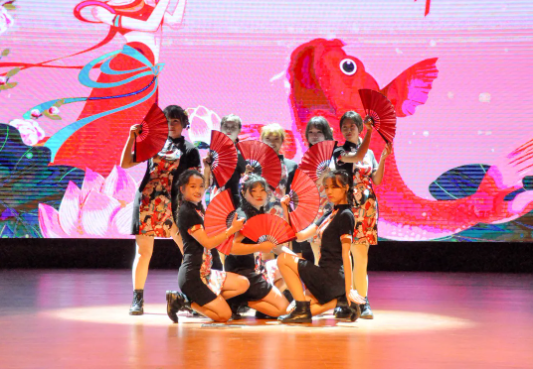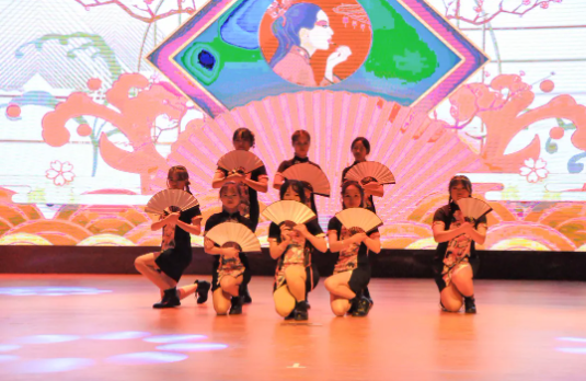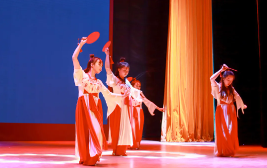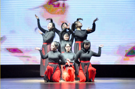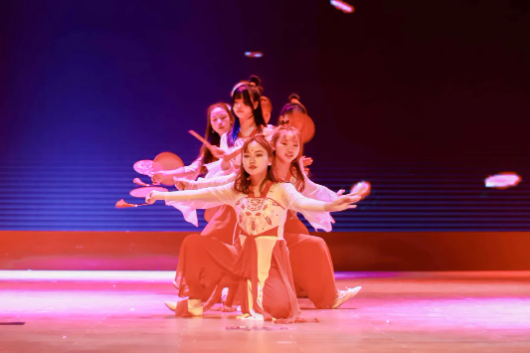 演員們舞姿靈動,神采飛揚,姿態(tài)曼妙,盡顯柔美;燈光做新衣,伴樂也陶醉,翩翩輾轉,是誰的心頭泛起了漣漪。