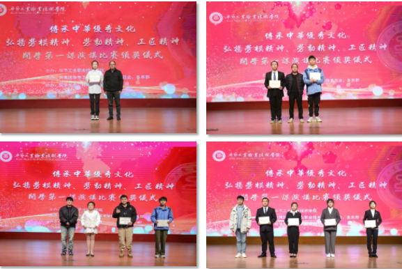 比賽現(xiàn)場(chǎng),十二位參賽選手緊扣活動(dòng)主題,結(jié)合自身學(xué)習(xí)心得體會(huì),用質(zhì)樸的語(yǔ)言、飽滿的熱情、真摯的情感從不同角度詮釋了勞模精神、勞動(dòng)精神、工匠精神,激勵(lì)和鼓舞同學(xué)們積極投身全面建設(shè)社會(huì)主義現(xiàn)代化國(guó)家的偉大實(shí)踐。各位選手言辭流利、妙語(yǔ)連珠,現(xiàn)場(chǎng)精彩的演講贏得了評(píng)委和觀眾們的陣陣掌聲。 經(jīng)過(guò)激烈角逐,評(píng)委組從演講內(nèi)容、語(yǔ)言表達(dá)、形象風(fēng)度、綜合印象、會(huì)場(chǎng)效果等方面對(duì)參賽選手的演講進(jìn)行了評(píng)分,評(píng)選出一、二、三等獎(jiǎng)及優(yōu)秀獎(jiǎng),機(jī)電汽車工程系獲得優(yōu)秀組織獎(jiǎng)。隨即舉行了頒獎(jiǎng)儀式。 據(jù)悉,此次比賽獲得前三名的選手將代表學(xué)院參加省級(jí)比賽,預(yù)祝他們?nèi)〉昧己玫某煽?jī)!