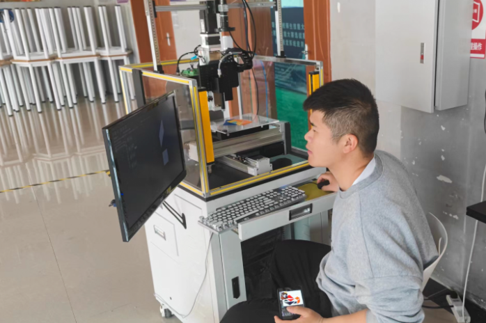 (張朝、田鳳老師指導的學生陳向東在機器視覺系統(tǒng)應用項目比賽現(xiàn)場)