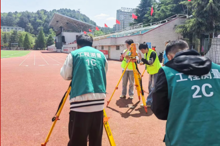 (靳海軍、李鳳老師指導的學生鄧密宏、吳磊、熊建發(fā)、張芳鑫在工程測量項目比賽現(xiàn)場)