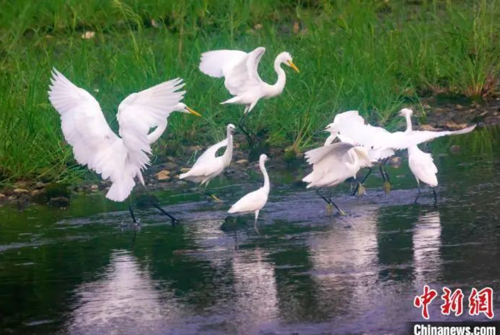資料圖:在山東省日照市五蓮縣洪凝河,白鷺在翩翩起舞。王義全 攝