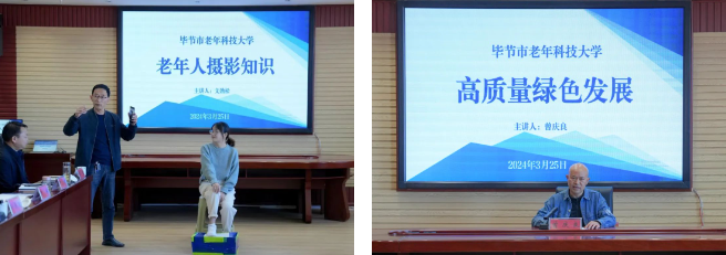 3月25日,“畢節(jié)市老年科技大學(xué)”掛牌儀式在畢節(jié)工業(yè)職業(yè)技術(shù)學(xué)院舉行。貴州省老科學(xué)技術(shù)工作者協(xié)會(huì)副會(huì)長(zhǎng)、畢節(jié)市老科學(xué)技術(shù)工作者協(xié)會(huì)會(huì)長(zhǎng)李克明,貴州省老科學(xué)技術(shù)工作者協(xié)會(huì)科學(xué)普及與教育專門委員會(huì)委員、畢節(jié)市老科協(xié)副會(huì)長(zhǎng)、畢節(jié)市老年科技大學(xué)校長(zhǎng)李瓊,畢節(jié)市科學(xué)技術(shù)協(xié)會(huì)副主席羅麗;學(xué)院黨委書記李涌,黨委副書記、院長(zhǎng)邱國(guó)援出席儀式,學(xué)院領(lǐng)導(dǎo)班子成員及相關(guān)部門負(fù)責(zé)人20余人參加儀式。儀式由李瓊主持。 李克明在會(huì)上表示,掛牌成立畢節(jié)市老年科技大學(xué)是提升我市老年人科學(xué)素質(zhì),切實(shí)有力推動(dòng)科技為民服務(wù)的客觀需要,標(biāo)志著我市科技教育和老年教育的融合發(fā)展,開(kāi)啟了我市對(duì)老年人開(kāi)展繼續(xù)教育和科普培訓(xùn)的新征程。老年科技大學(xué)要堅(jiān)持以提升老年人的科學(xué)素養(yǎng)、健康素質(zhì)、數(shù)字技能等為目標(biāo),進(jìn)一步擴(kuò)大老年教育資源供給,助力科學(xué)普及,推動(dòng)科技為民服務(wù),為建設(shè)新發(fā)展理念示范區(qū)、譜寫中國(guó)式現(xiàn)代化畢節(jié)實(shí)踐新篇章貢獻(xiàn)智慧和力量。 授牌儀式結(jié)束后,市老年科技大學(xué)副校長(zhǎng)文勁松、市老科學(xué)技術(shù)工作者協(xié)會(huì)智庫(kù)專家曾慶良分別開(kāi)展了《老年人攝影知識(shí)》和《高質(zhì)量綠色發(fā)展》現(xiàn)場(chǎng)授課。