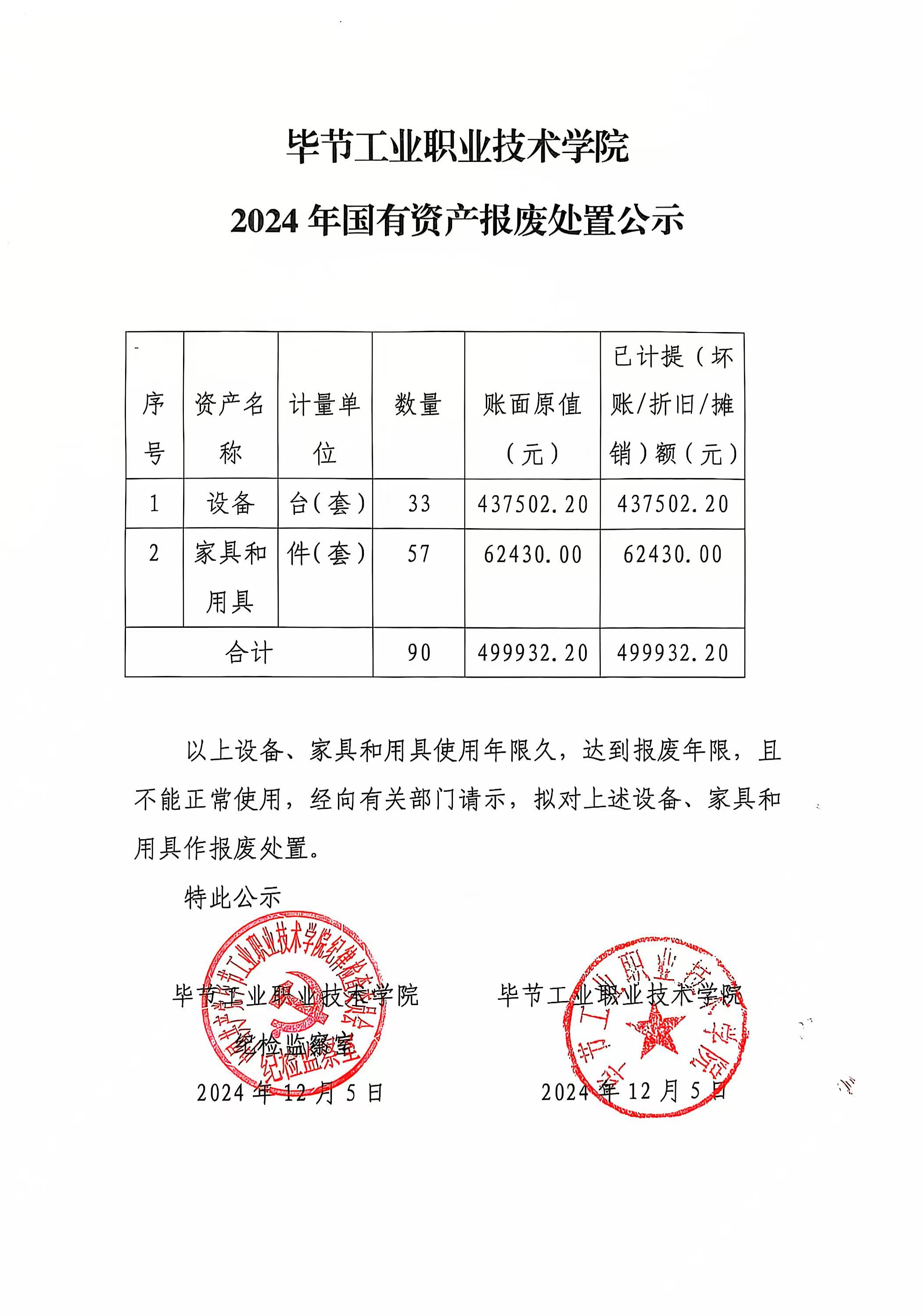 畢節(jié)工業(yè)職業(yè)技術(shù)學(xué)院2024年國有資產(chǎn)報廢處置公示