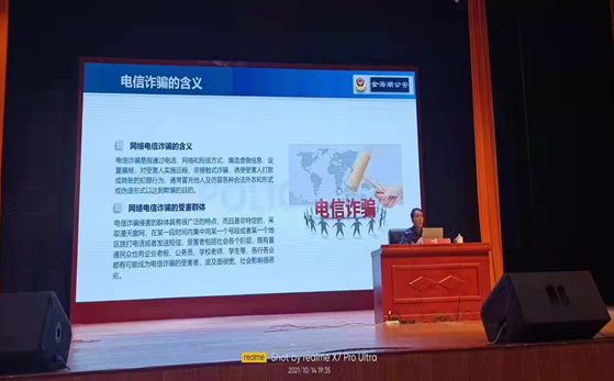 吳警官結(jié)合職業(yè)院校學(xué)生的特點(diǎn),用發(fā)生在學(xué)生身邊的電話詐騙、網(wǎng)絡(luò)詐騙、兼職招聘等熱點(diǎn)案例,采取通俗易懂、喜聞樂見的方式,對(duì)新型電信詐騙的種類形式、規(guī)律特點(diǎn)以及如何預(yù)防作了詳細(xì)闡述,引導(dǎo)學(xué)生增強(qiáng)防范意識(shí),提高識(shí)騙防騙能力,確保自身生命財(cái)產(chǎn)安全。隨后,吳警官給全體師生普及禁毒常識(shí),詳細(xì)介紹毒品的種類,講解毒品對(duì)人體和家庭的危害及對(duì)社會(huì)的影響,告誡大家珍愛生命,自覺抵制毒品。最后,吳濤警官針對(duì)職業(yè)院校中部分學(xué)生性格沖動(dòng)、自控能力較弱、法制觀念淡薄的一些不良現(xiàn)象,用發(fā)生在學(xué)生身邊的生動(dòng)案例、深刻的教訓(xùn),警示學(xué)生要遵紀(jì)守法,不要做讓個(gè)人后悔、家庭蒙羞、社會(huì)不安的糊涂事情,教育大家要充分認(rèn)識(shí)尋釁滋事、打架斗毆、盜竊等青少年違法犯罪的嚴(yán)重危害,正確處理好各種關(guān)系,充分珍惜大好學(xué)習(xí)時(shí)光,學(xué)有所成,以真才實(shí)學(xué)匯報(bào)父母和社會(huì)。