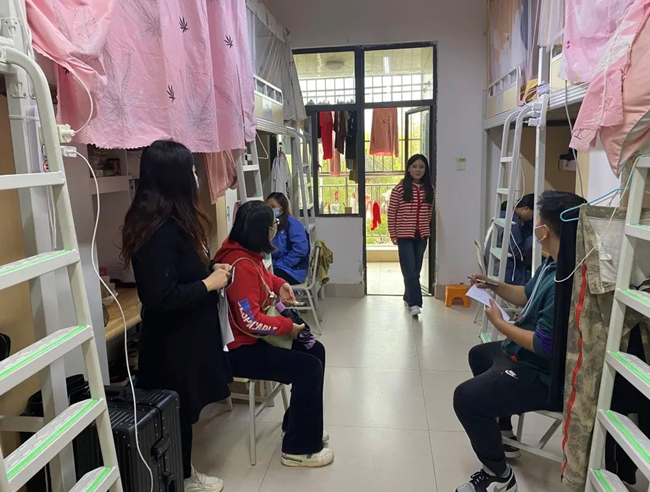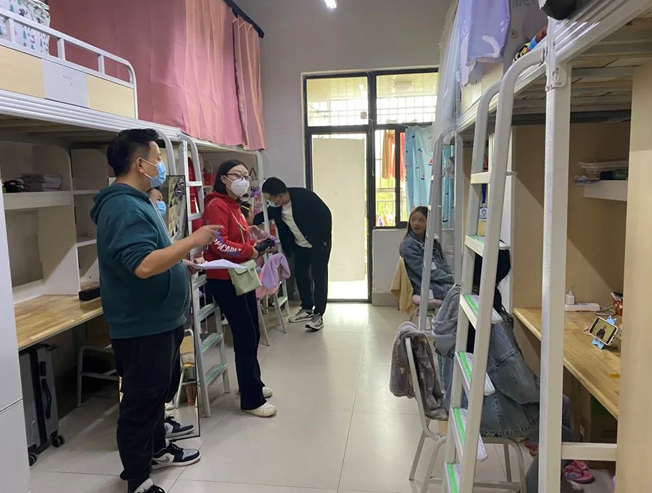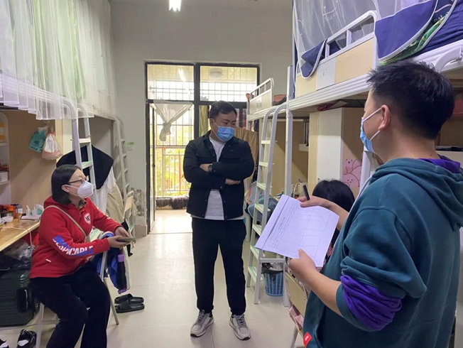 我系聶濤、史曉嵐、何應(yīng)垚、蒙光國等多名老師第一時間趕赴學院防控一線,組織開展疫情靜默期間各項工作,并帶領(lǐng)我系志愿者同學用心用情服務(wù)學生、關(guān)愛學生。在靜默期間走訪學生寢室,關(guān)注重點特殊人群、排查心理健康異常情況等,并做好相應(yīng)記錄。