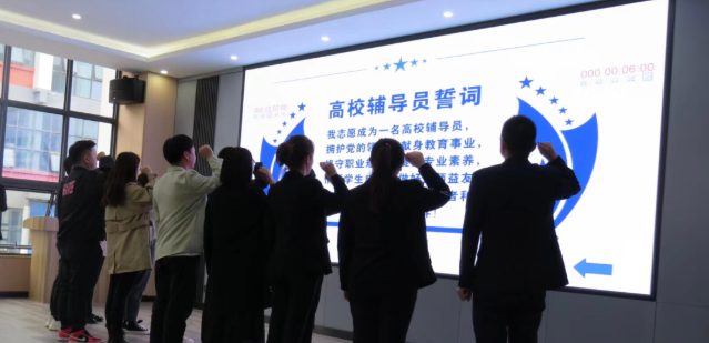 儀式上,全體輔導(dǎo)員對照“高校輔導(dǎo)員誓詞”進(jìn)行宣誓;黨委委員、副院長黃文碧對本次大賽進(jìn)行致辭;致辭結(jié)束,黨委委員、學(xué)院副書記付善華宣布大賽正式開始。