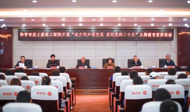 5月20日,畢節(jié)市關(guān)工委主任周長琦、副主任吳學(xué)香、楊旭、張志俠、梁軍一行受邀赴我院開展“老少同聲頌黨恩·喜迎黨的二十大”主題教育宣講,并實(shí)地調(diào)研我院辦學(xué)情況。學(xué)院黨委班子成員李涌、邱國援、付善華、黃文碧、申開谷,工會、婦聯(lián)主席李淑文及相關(guān)部門人員陪同調(diào)研。宣講會由黨委副書記付善華主持,學(xué)院師生代表200余人聆聽宣講。