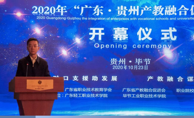 10月23日,廣東?貴州產(chǎn)教融合促進(jìn)大會在畢節(jié)隆重召開。廣東省教育廳巡視員朱俊文,貴州省教育廳一級巡視員鞠洪出席會議并致辭,畢節(jié)市委常委、副市長胡愛斌致歡迎辭,廣東輕工職業(yè)技術(shù)學(xué)院黨委書記杜安國作介紹,會議由畢節(jié)工業(yè)職業(yè)技術(shù)學(xué)院黨委副書記、院長邱國援全程主持。廣東省教育廳、貴州省教育廳、廣州市教育局、畢節(jié)市教育局相關(guān)負(fù)責(zé)人及參與產(chǎn)教融合大會的校企單位主要負(fù)責(zé)人參加會議。此次會議由廣東省職業(yè)技術(shù)教育學(xué)會、廣東省產(chǎn)教融合促進(jìn)會、職業(yè)院校協(xié)同發(fā)展聯(lián)盟主辦,廣東輕工職業(yè)技術(shù)學(xué)院、畢節(jié)工業(yè)職業(yè)技術(shù)學(xué)院承辦。