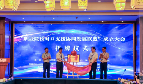 廣東省教育廳二級(jí)巡視員朱俊文,貴州省教育廳黨組副書記、副廳長(zhǎng)鞠洪,畢節(jié)市人民政府副市長(zhǎng)謝培午,廣東輕工職業(yè)技術(shù)學(xué)院黨委書記、廣東省職業(yè)技術(shù)教育學(xué)會(huì)會(huì)長(zhǎng)杜安國(guó),畢節(jié)工業(yè)職業(yè)技術(shù)學(xué)院黨委書記李涌一同出席聯(lián)盟成立大會(huì)并致辭,共同為“職業(yè)院校對(duì)口支援協(xié)同發(fā)展聯(lián)盟”揭牌。
